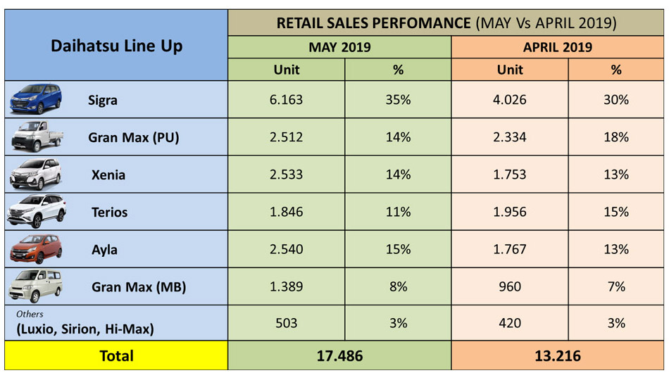 Daihatsu kembali merilis data pencapaian penjualannya. Tercatat pada bulan Mei 2019, total angka retail sales Daihatsu mencapai 17.486 unit, naik sekitar 32% dibanding bulan April lalu, yakni sebesar 13.216 unit. Hal ini tidak lepas dari tingginya permintaan masyarakat saat menjelang libur lebaran lalu.